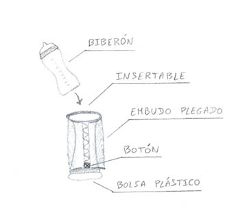 Una herramienta portátil de tamaño reducido y que se pueda acoplar con cualquier biberón. Con un gesto simple se desplegaría para coger la forma de un embudo. A su base, se engancharía fácilmente cualquier bolsa de plástico.